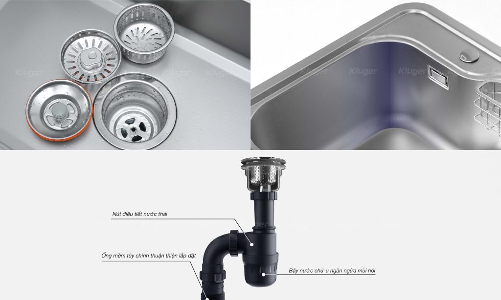 Thiết kế: Cấu tạo 1 hố, đáy dốc 3° thoát sạch nước, luôn giữ cho chậu và bàn bếp khô ráo.