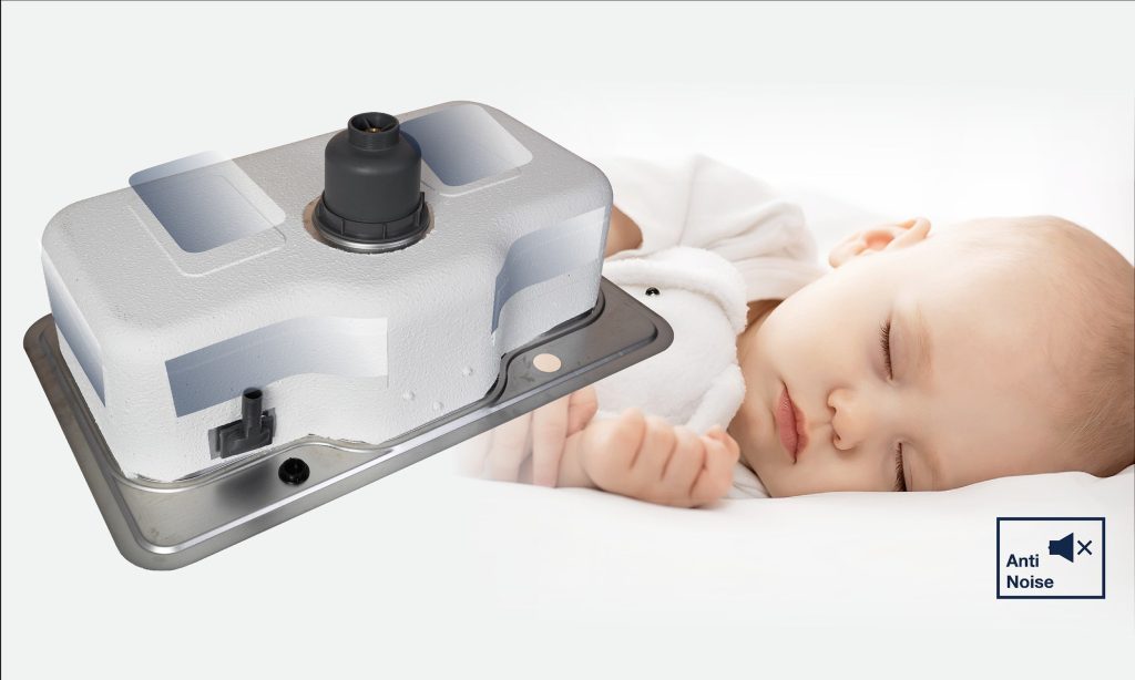 Công nghệ chống ồn: Lớp đệm cao su được đặt dưới chậu bếp nhằm giảm tiếng ồn gây ra khi rửa bát hoặc sử dụng nước trong chậu.