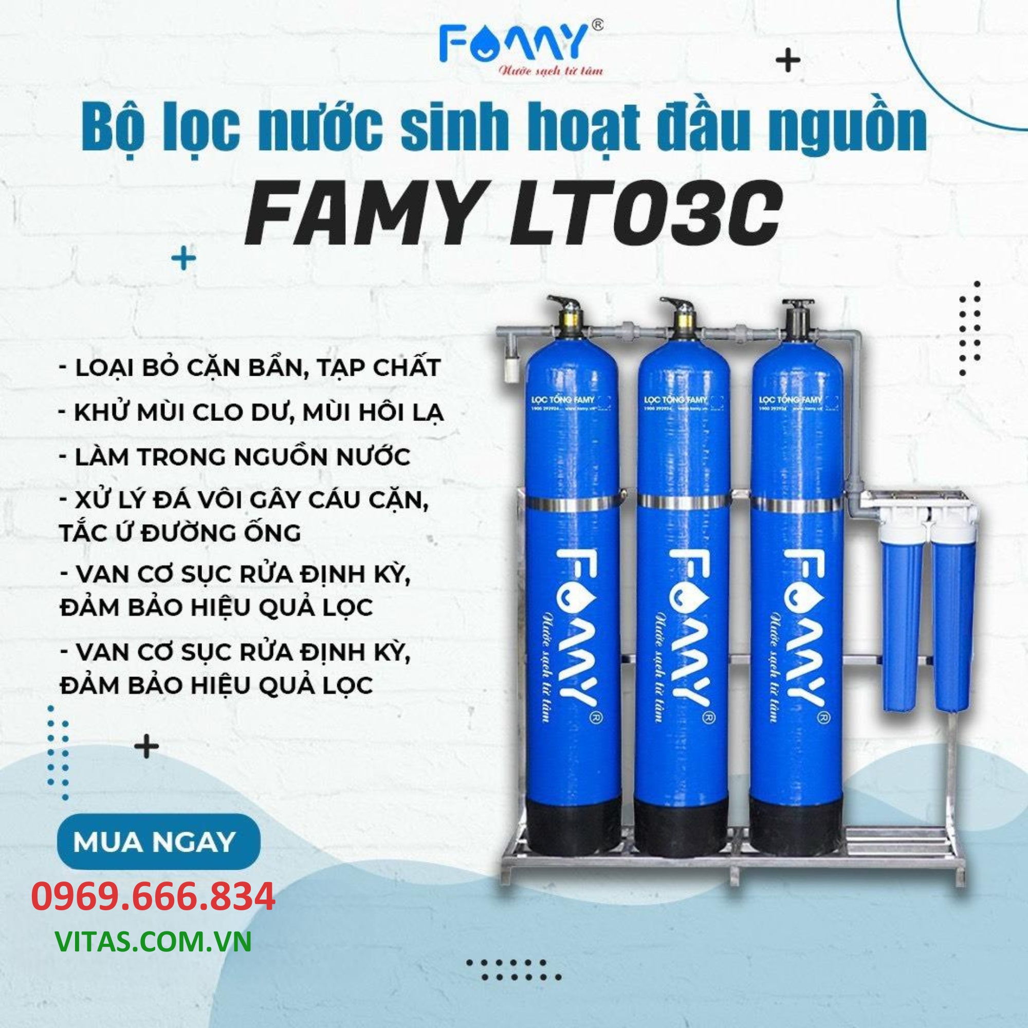 Ứng dụng công nghệ tiên tiến, hiện đại cùng hệ thống 3 cột lọc cao cấp với vật liệu nhập khẩu, hệ thống lọc tổng Famy LT03C